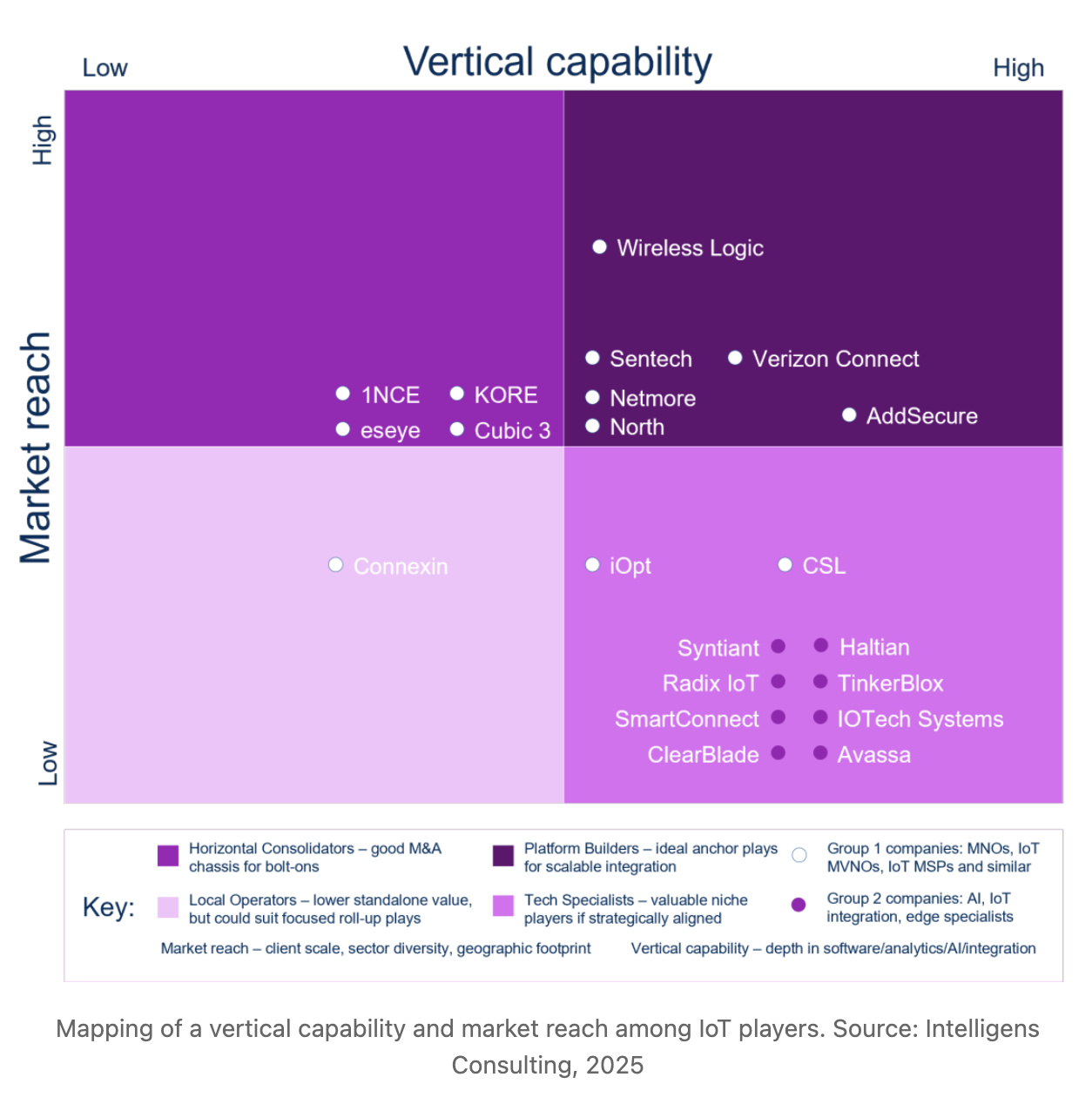 Each potential target differs in terms of vertical capability and market reach. Figure 1 maps a selection of IoT market players—from MNOs and MVNOs to software, AI, and edge analytics providers—according to these two key dimensions.