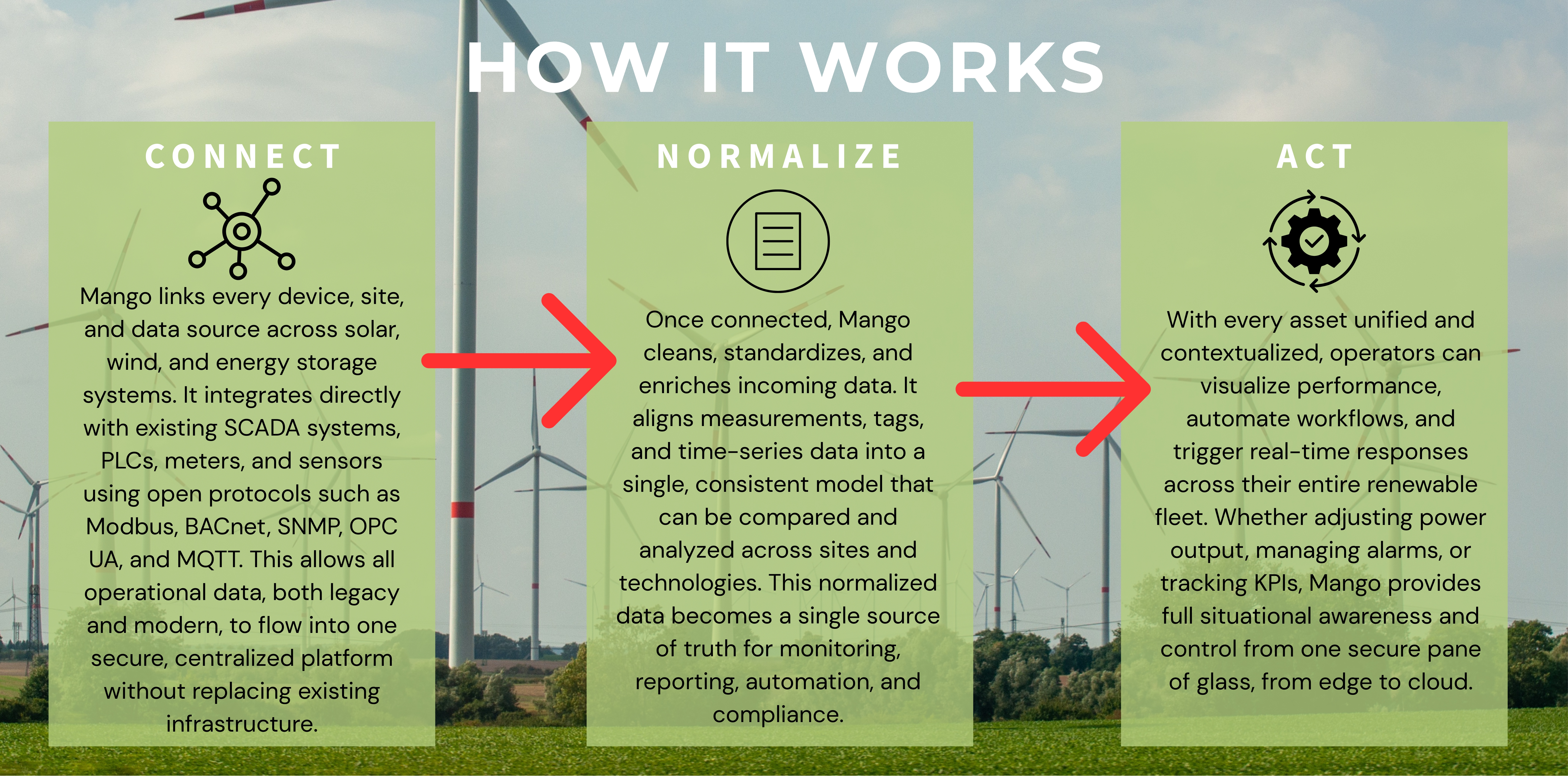 - Act. With every asset unified and contextualized, operators can visualize performance, automate workflows, and trigger real time responses across the entire renewable fleet. Whether adjusting power output, managing alarms, or tracking KPIs, Mango provides full situational awareness and control from one secure pane of glass, from edge to cloud.