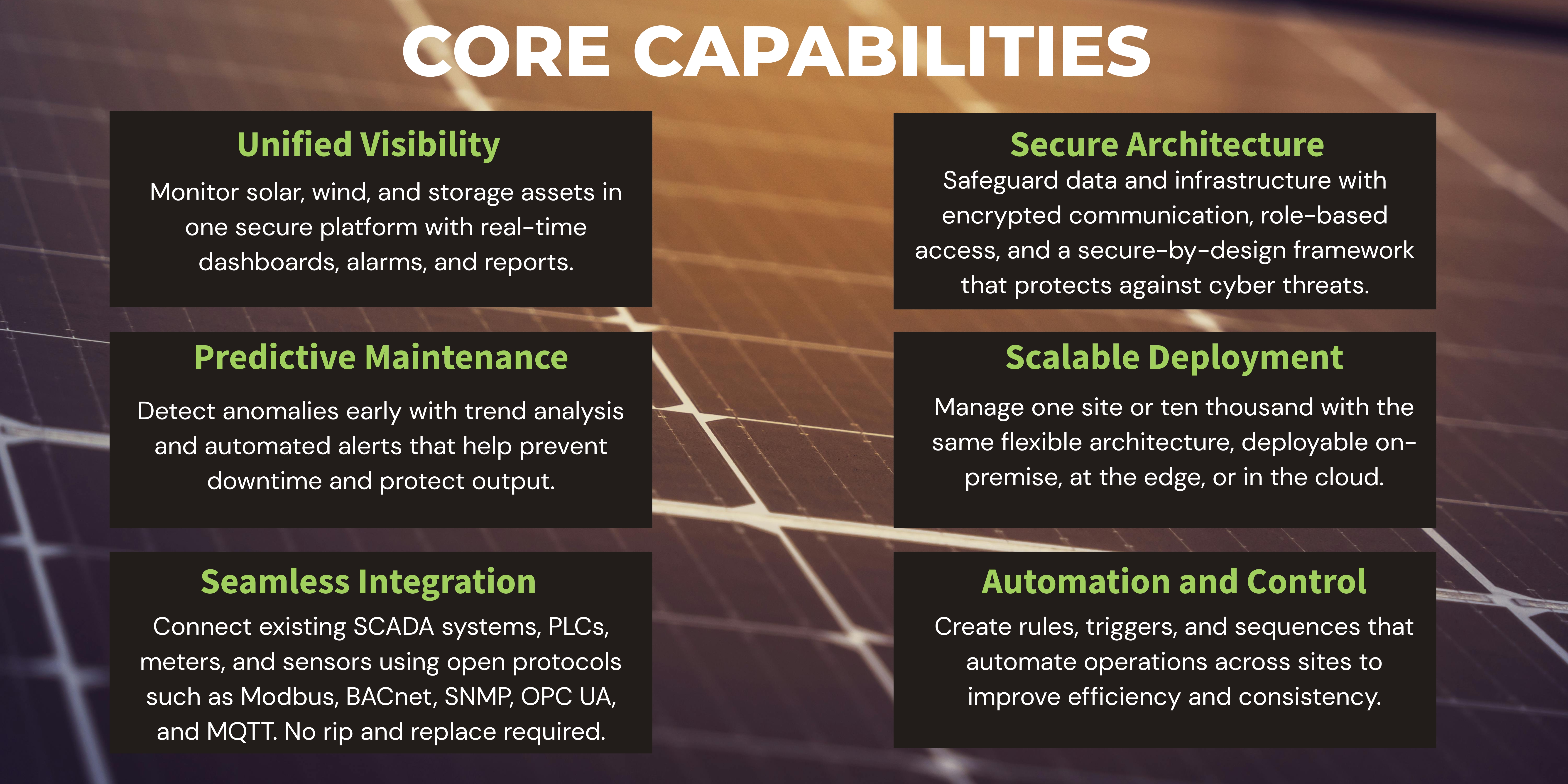 - Unified visibility across solar, wind, and storage assets in one secure platform with real time dashboards, alarms, and reports.